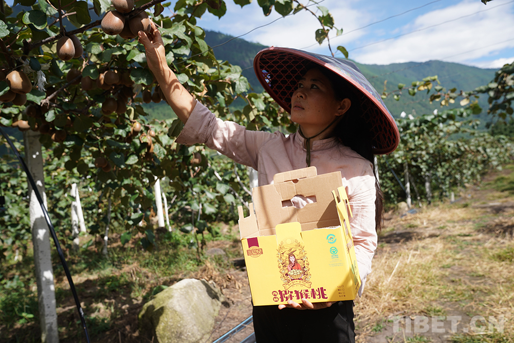圖為(wei) 老鄭的妻子在下察隅鎮夏尼村獼猴桃種植基地采摘獼猴桃 攝影:王淑