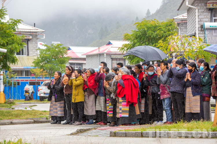 走出尼瑪頓珠家,十一世班禪數次停下腳步向冒雨在此等候的信教群眾(zhong) 揮手致意,信教群眾(zhong) 紛紛雙手合十,向十一世班禪虔誠朝拜。