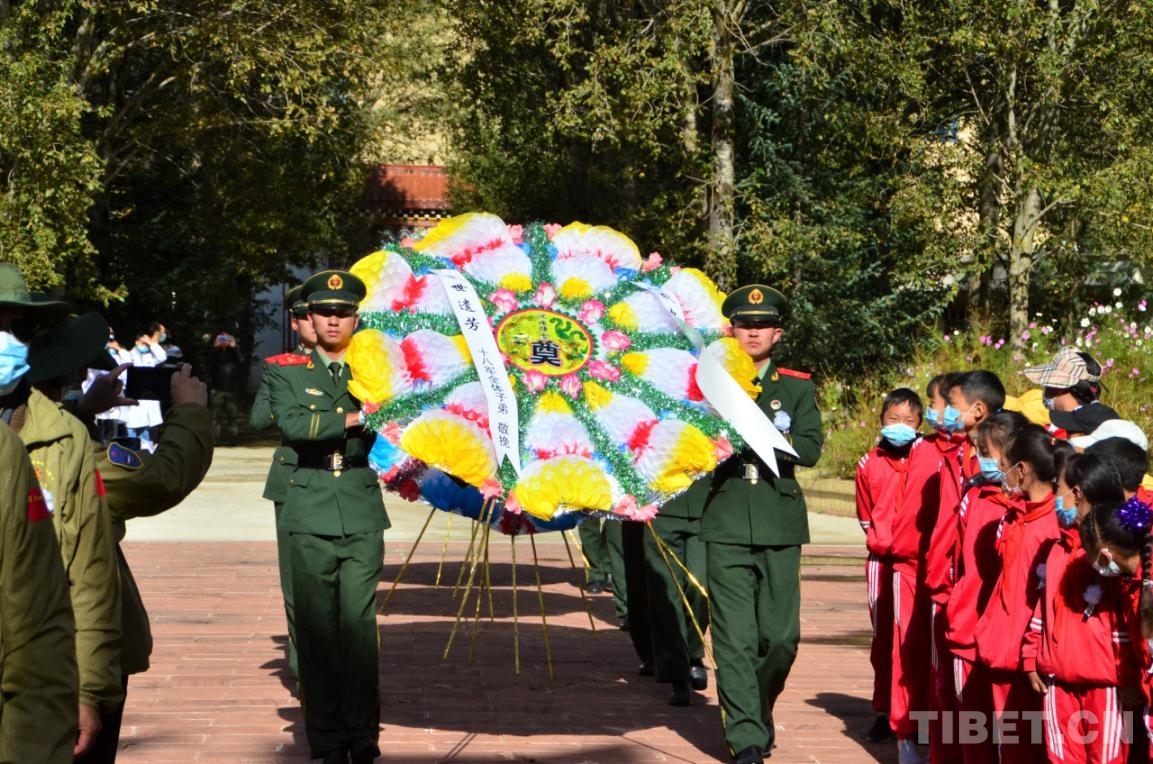 祭掃儀(yi) 式上,十八軍(jun) 後代代表、甘孜縣相關(guan) 領導、少先隊員代表脫帽、肅立、默哀,武警官兵向革命烈士敬獻花圈。十八軍(jun) 政委譚冠三之女譚齊峪,十八軍(jun) 副政委王其梅之女王昌為(wei) ,十八軍(jun) 參謀長李覺之女李洪,原西藏自治區黨(dang) 委第一書(shu) 記陰法唐之女陰建白,原十八軍(jun) 作戰參謀盧廣葉之子盧長健上台整理挽聯,悼念革命先烈。