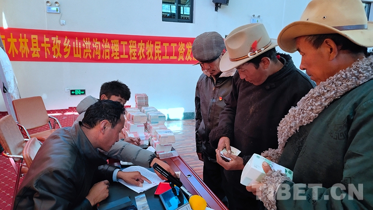 圖為(wei) 西藏自治區日喀則市南木林縣卡孜鄉(xiang) 山洪溝治理工程項目民工工資發放暨勞務合作社分紅儀(yi) 式現場