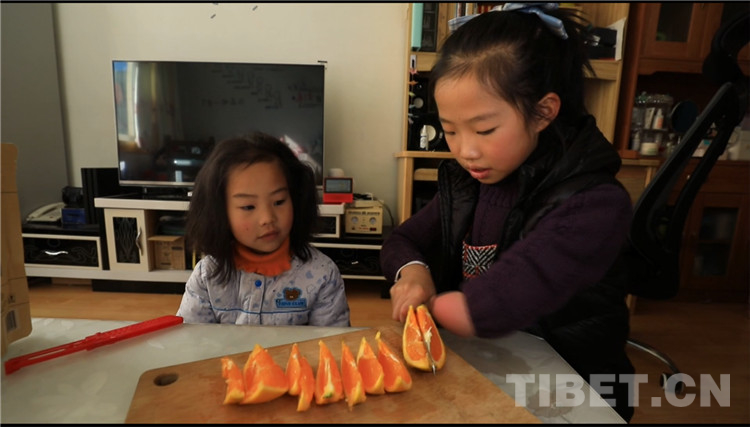圖為(wei) 熊婉晴為(wei) 妹妹熊悠然切橙子