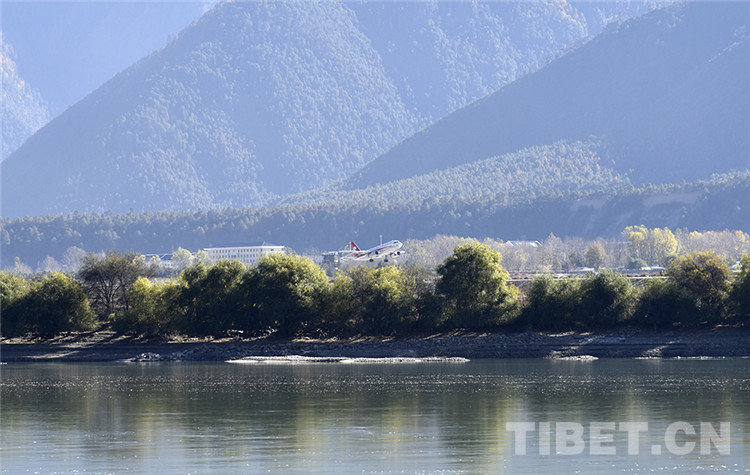 圖為(wei) 一架飛機從(cong) 西藏自治區林芝市米林機場起飛 攝影:王媛媛