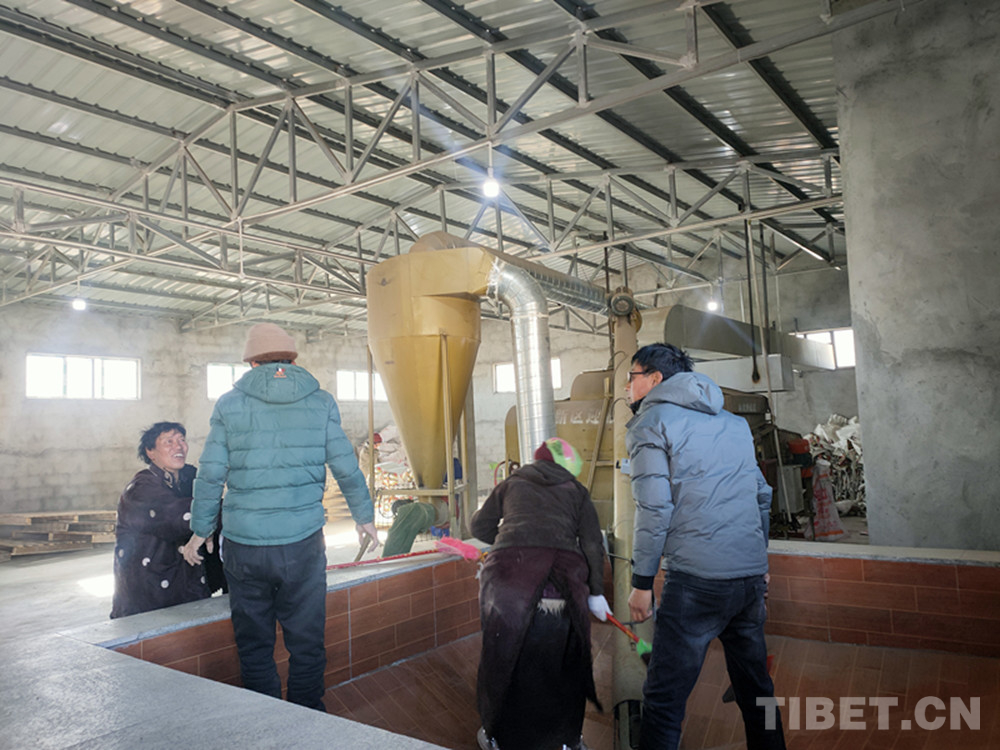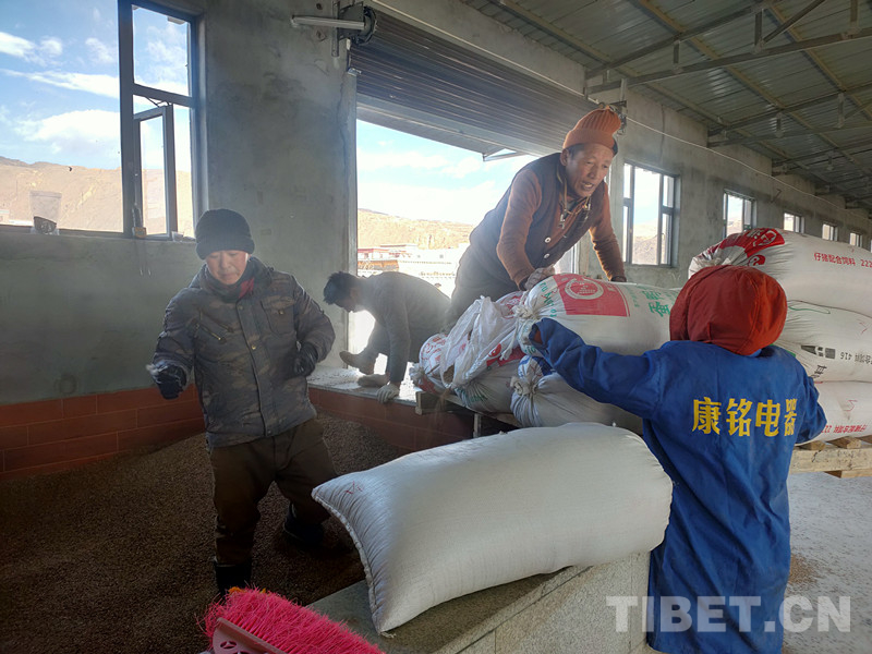 在該園的格薩甲波糧倉(cang) 現場,裝滿糧食的拖拉機和貨車,有的忙著把青稞卸下來,有的忙著把青稞倒進糧食精選機裏、有的忙著稱重、有的忙著做登記,忙得不可開交。