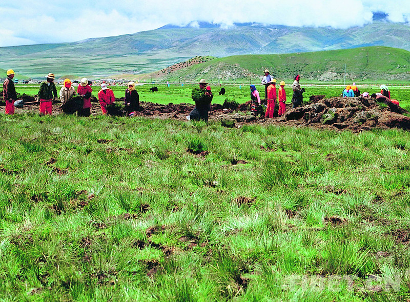圖為(wei) 為(wei) 保護藏北高原上的生態植被,中鐵五局職工同藏族群眾(zhong) 一起,將修“天路”處的草皮移走,養(yang) 植在旁邊。待日後鐵路修通後,再將它移植到鐵路路基的邊坡上(唐召明2003年攝)