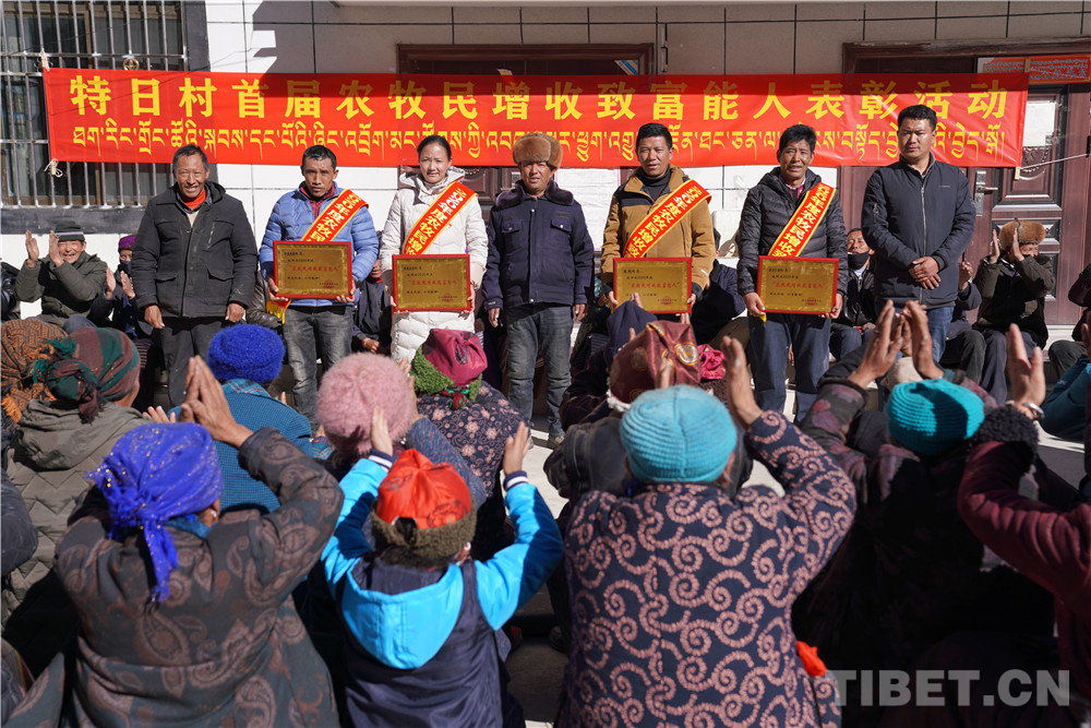 在表彰活動現場,高掛著特日村首屆農(nong) 牧民增收致富能人表彰活動的大紅橫幅。洛桑白珍、尼瑪、格桑頓珠、桑傑巴珠四人身掛“2020年度農(nong) 牧民增收致富能人”綬帶接受表彰。在村“兩(liang) 委”班子成員為(wei) 這四人獻哈達、發獎牌和每人500元的獎金時,現場的氣氛更是達到了高潮。