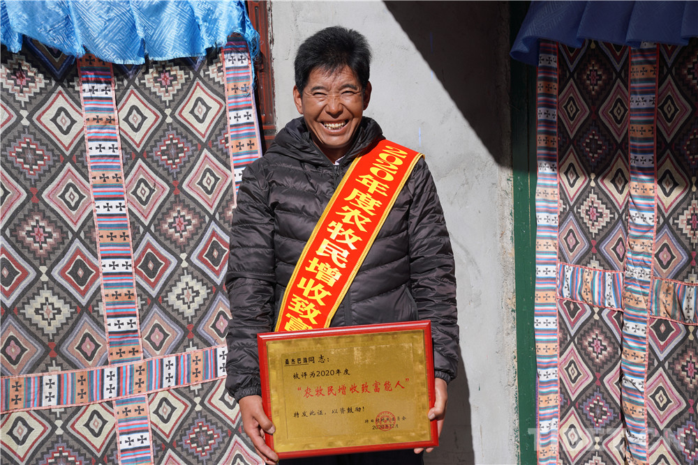 勞動致富的桑傑巴珠。他曾經是享受國家補助的一般貧困戶。為(wei) 了早日摘掉貧困帽子,自2019年開始,他先後貸款5萬(wan) 元購買(mai) 拖拉機,在工地上搞運輸;參加了塗裝工、抹灰工培訓班,以技術求創收;在拉薩、澤當承包工地人工。艱辛的努力收獲了香甜的碩果,如今的桑傑巴珠日工資最低300元;2020年帶動本村12人就業(ye) ,共創收達48萬(wan) 多元。他的大女兒(er) 米瑪卓瑪於(yu) 2018年考上了湖北理工學院漢語文專(zhuan) 業(ye) ,小女兒(er) 拉巴曲珍考上了山南完中,曾經的困難戶華麗(li) 轉身成為(wei) 小康人家。