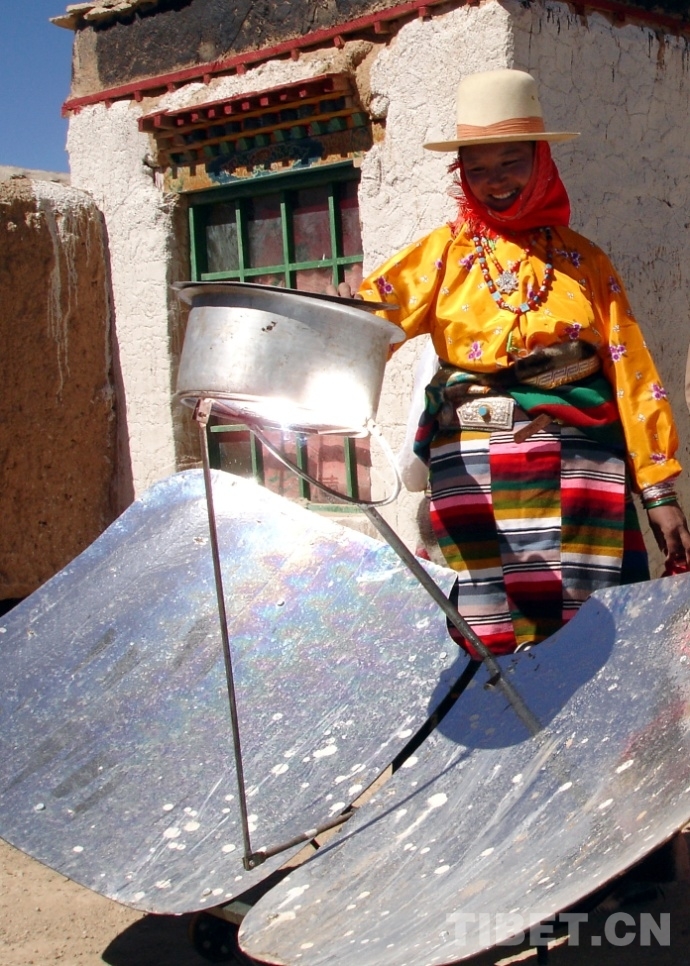 在藏北高原,現在隨處可見城鎮裏的一個(ge) 個(ge) 太陽能路燈、一棟棟太陽能采暖樓和采暖房,一排排房頂上斜立著的太陽能熱水器,就連牧民家也常常可以看到安放在窗前、屋頂和院內(nei) 的電池板、太陽灶。利用太陽能燒水做飯和發電照明,既方便又幹淨,老天爺還不收燃料費。