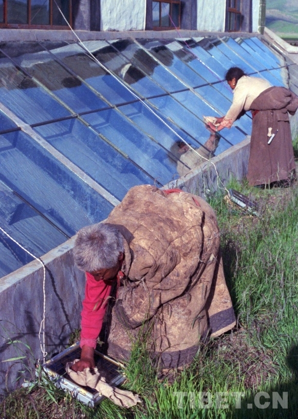 圖為(wei) 藏北那曲縣(現改為(wei) 色尼區)建成的集太陽能采暖、矽光照明、太陽灶做飯的養(yang) 老院。圖為(wei) 五保戶老人正在擦拭采暖房玻璃和矽光電池板 唐召明1988年攝