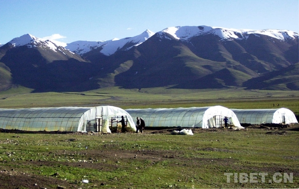 圖為(wei) 藏北申紮縣城附近新建的太陽能蔬菜大棚,解決(jue) 了當地群眾(zhong) 吃菜難的問題 唐召明2001年7月4日攝