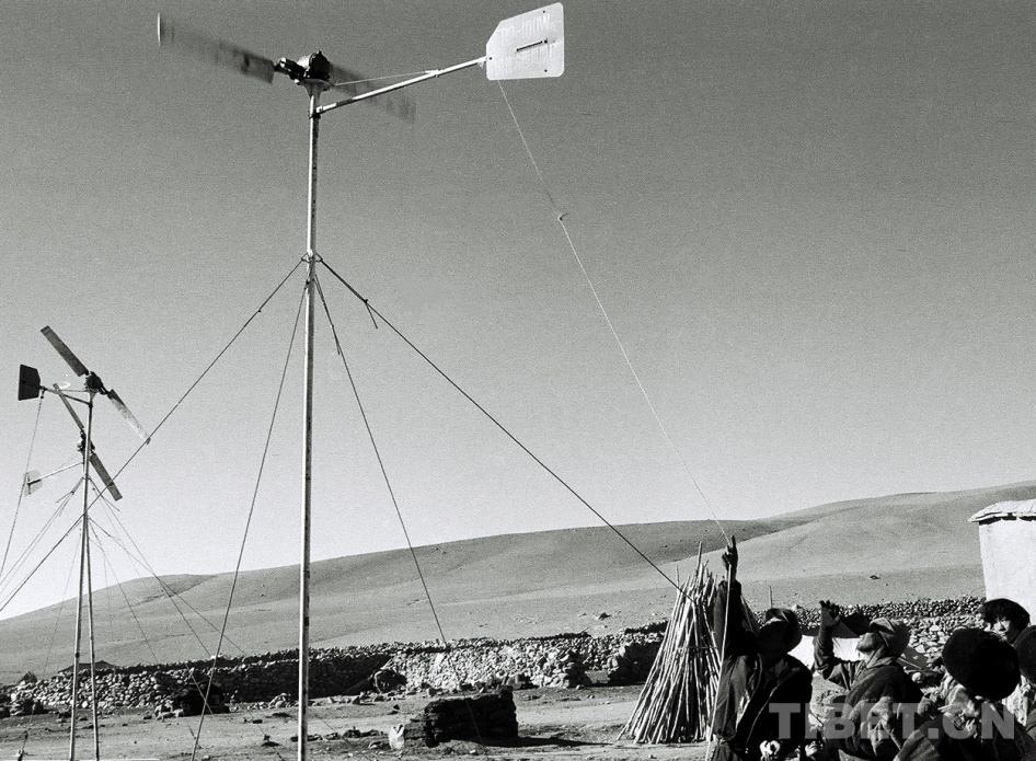 圖為(wei) 那曲風能實驗站技術人員為(wei) 雙湖辦事處(現改為(wei) 雙湖縣)嘎措鄉(xiang) 牧民檢修保養(yang) 所安裝的風力發電機 唐召明1988年攝