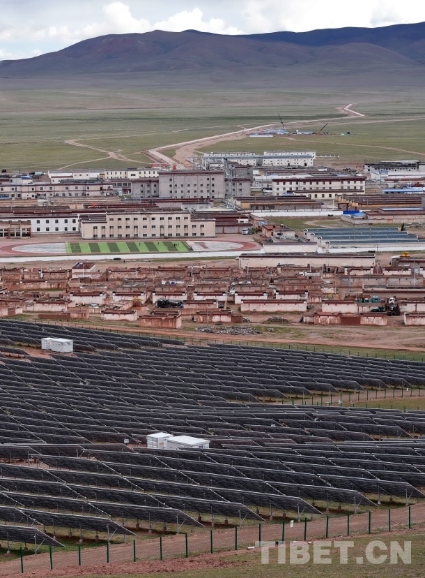 圖為(wei) 藏北雙湖縣新建成的太陽能光伏電站。照片前景所豎立的成片黑色板是用來發電的矽光電池板 唐召明2017年7月25日攝