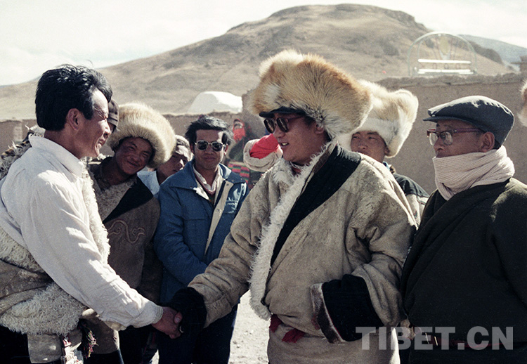 圖為(wei) 率隊參加文部辦事處基層政權建設工作現場會(hui) 的時任那曲地區行署專(zhuan) 員土登才旺(中)與(yu) 文部辦事處幹部交流(唐召明1989年12月28日攝)
