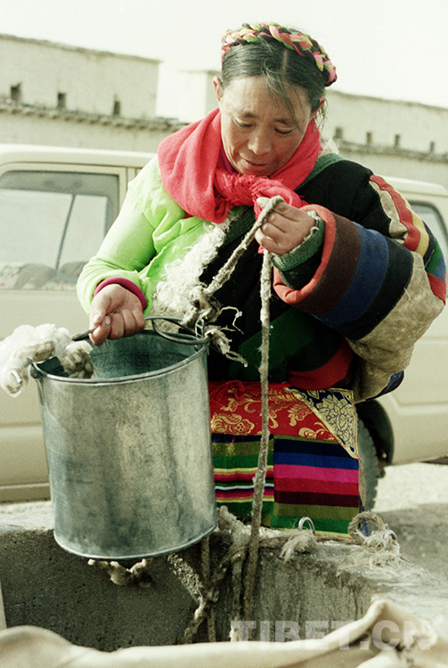 圖為(wei) 文部辦事處申亞(ya) 鄉(xiang) 女鄉(xiang) 長卓瑪在打井水。她當時是全國“三八”紅旗手、那曲地區唯一的女鄉(xiang) 長(唐召明1989年12月攝)