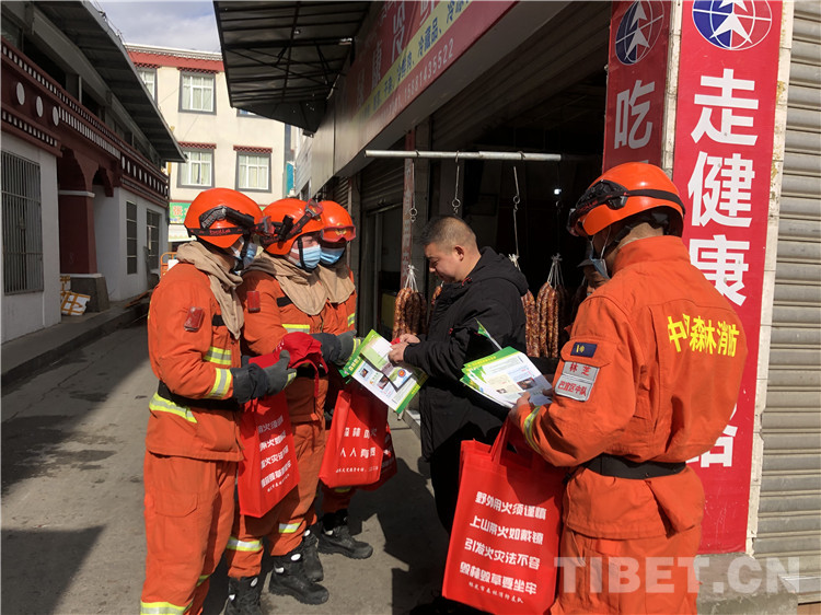 圖為(wei) 米林縣森林消防中隊指戰員們(men) 走街串巷向居民們(men) 宣傳(chuan) 防火小常識並發放宣傳(chuan) 資料