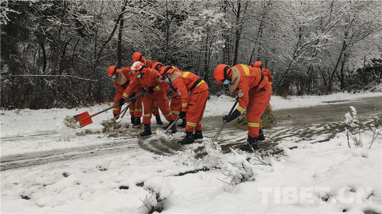 圖為(wei) 消防員們(men) 正在清理道路積雪,為(wei) 過往車輛保駕護航