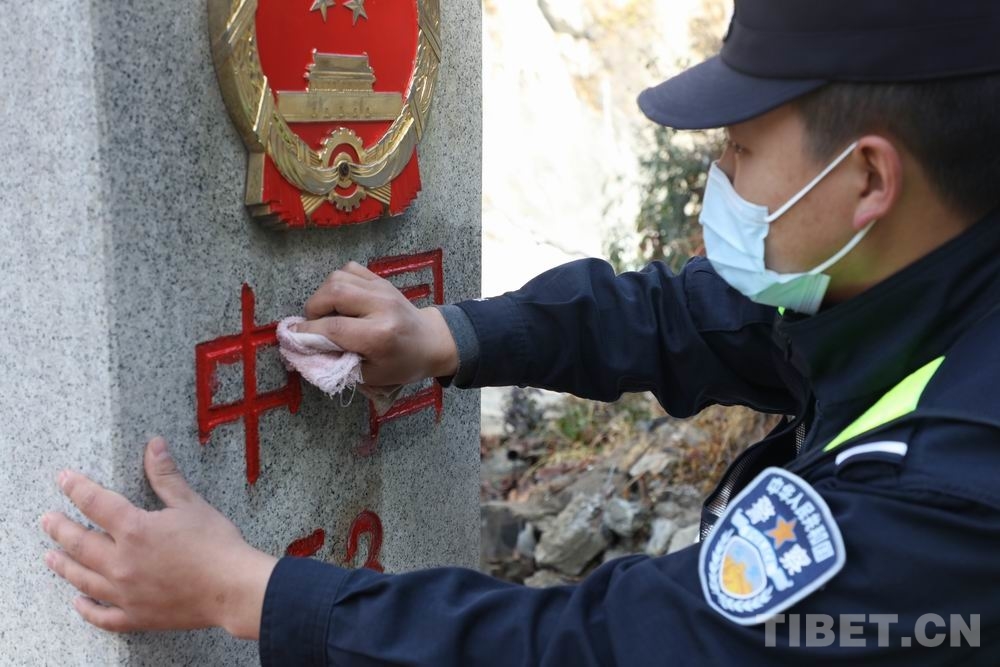 圖為(wei) 執勤點民警為(wei) 神聖的界碑描紅 攝影:鄒興(xing) 國