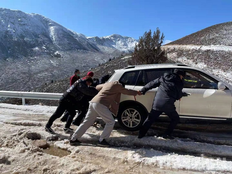 麵對焦急萬(wan) 分的父親(qin) ,為(wei) 了讓病中的孩子第一時間得到醫治,根秋降澤立即下車施救。由於(yu) 鄉(xiang) 村道路路況較差,加之冰雪覆蓋,車輛打滑嚴(yan) 重,施救過程十分艱難。根秋降澤憑借多年應對冰雪路況的駕駛經驗,組織大家在極度嚴(yan) 寒、工具缺乏的情況下,通過刨冰除雪、手推車拉的方式,經過半個(ge) 多小時的努力終於(yu) 讓被困車輛擺脫困境。根秋降澤捂著凍僵的手,一再提醒駕駛員要常備防滑鏈條,在冰雪路段需小心謹慎駕駛,切勿急打方向等注意事項。