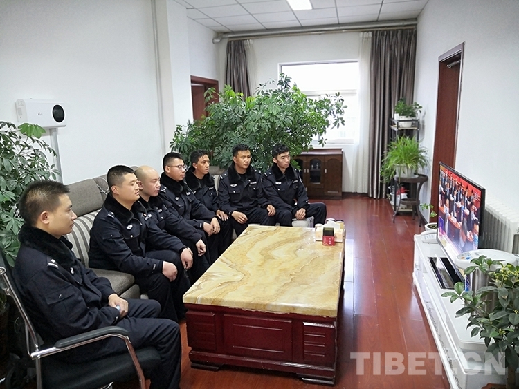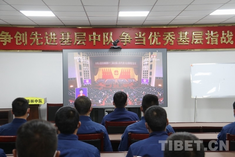圖為(wei) 昌都市左貢縣森林消防中隊隊員收看全國兩(liang) 會(hui) 直播