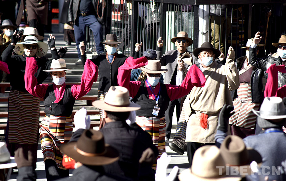 當熱情的鍋莊舞曲傳(chuan) 遞到健身場地時,老大爺德欽雲(yun) 丹正講解完一個(ge) 動作要領,數著節拍帶領大家運動起來。