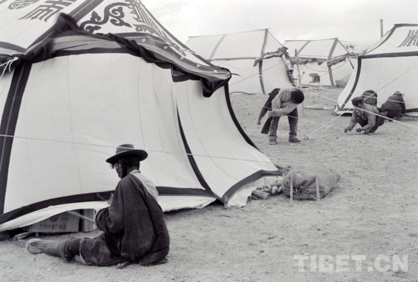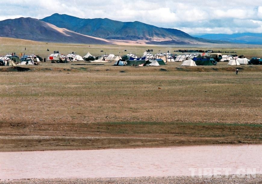 圖為(wei) 在文部辦事處(現改為(wei) 尼瑪縣)的布藏河畔舉(ju) 行賽馬會(hui) 前,城鎮人家正在搭建各自的帳篷(唐召明1987年攝)