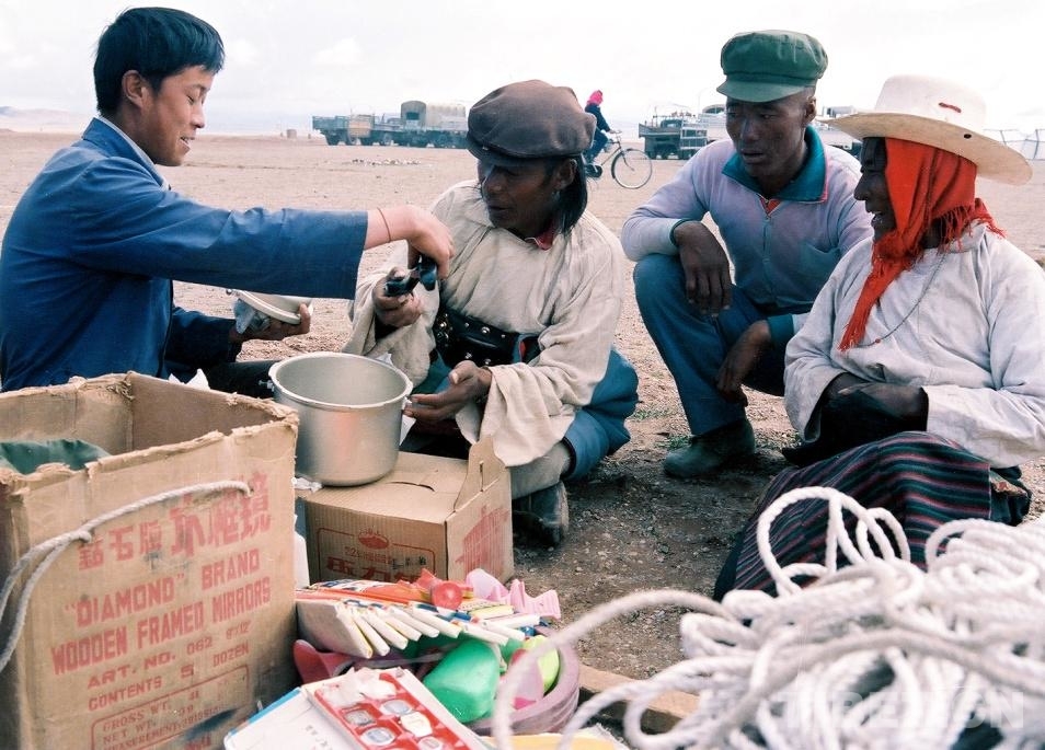 圖為(wei) 在文部辦事處(現改為(wei) 尼瑪縣)賽馬會(hui) 上,如“候鳥”一樣飛來飛去的漢族商販在經營小商品(唐召明1987年攝)