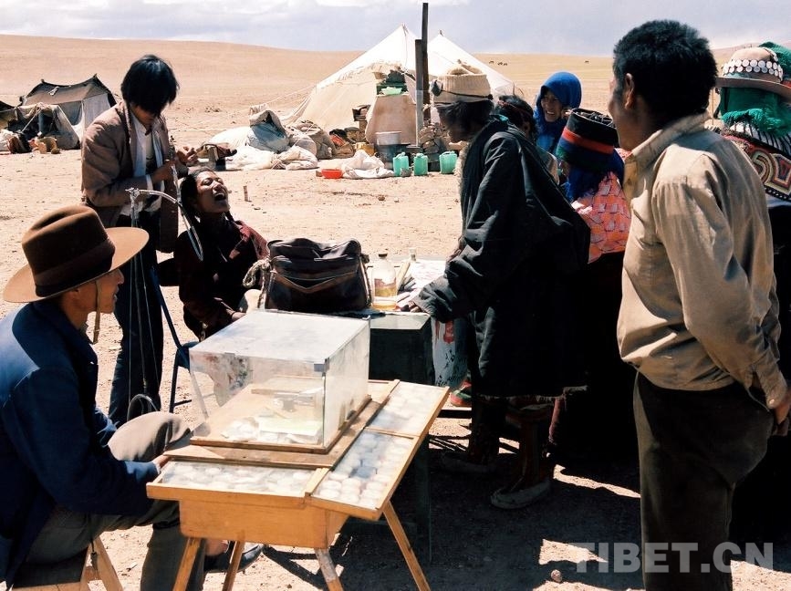 圖為(wei) 在文部辦事處(現改為(wei) 尼瑪縣)賽馬會(hui) 上,“候鳥”型的漢族商販在擺攤鑲牙和修表(唐召明1987年攝)