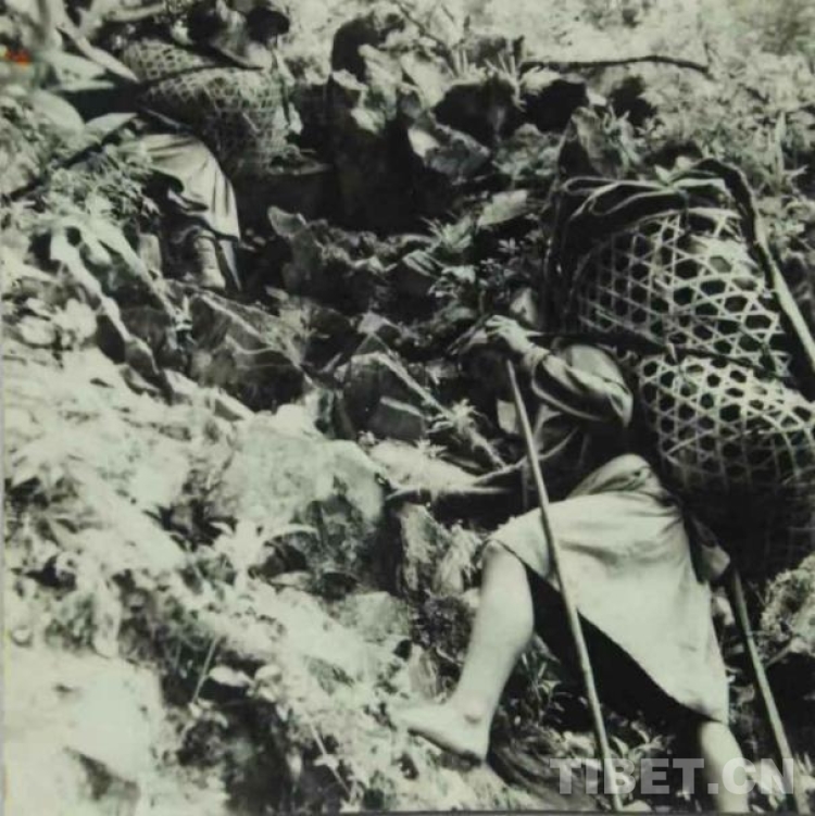 舊西藏,墨脫群眾(zhong) 赤腳徒步爬山背運物資的情景