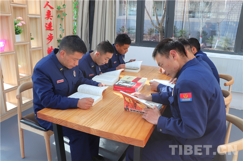 圖為(wei) 西藏昌都市卡若區森林消防中隊學習(xi) 黨(dang) 史書(shu) 籍