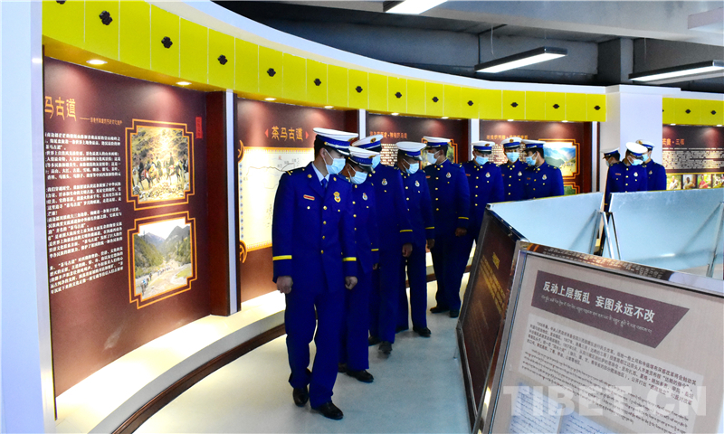圖為(wei) 左貢縣森林消防中隊駐芒康縣分隊全體(ti) 指戰員重溫18軍(jun) 進藏的艱苦曆程 攝影:彭順雄