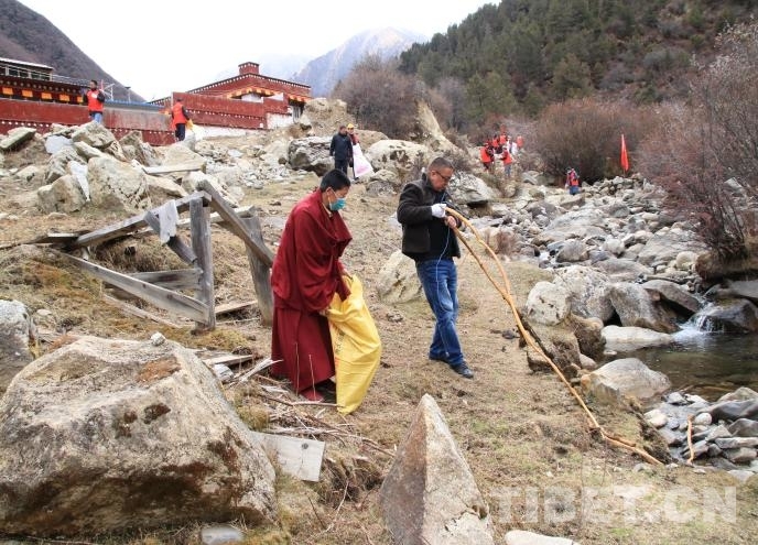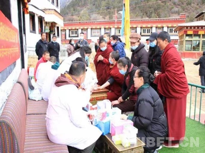 圖為(wei) 有關(guan) 工作人員在娘蒲鄉(xiang) 古覺拉康無償(chang) 為(wei) 僧尼送醫送藥送政策