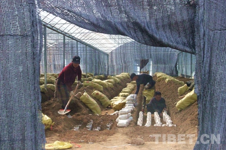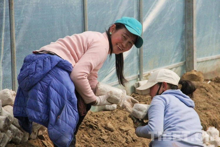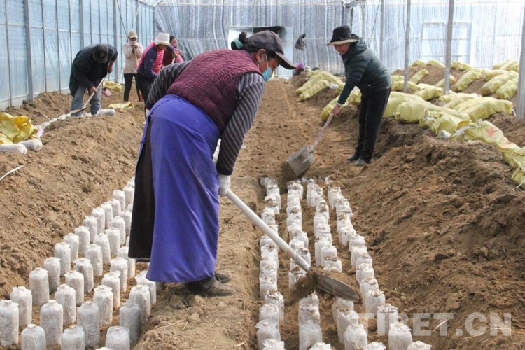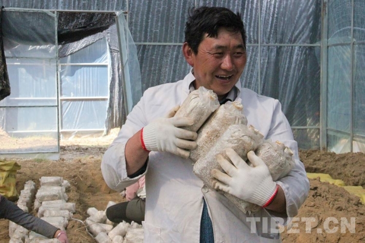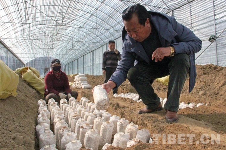 圖為(wei) 尼瑪指導村民種植靈芝菌包