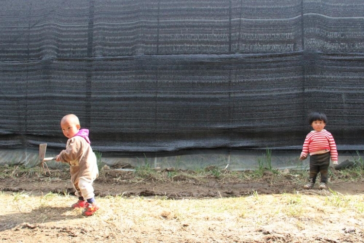 圖為(wei) 村中小孩學著大人的模樣,拿起鐵鍬