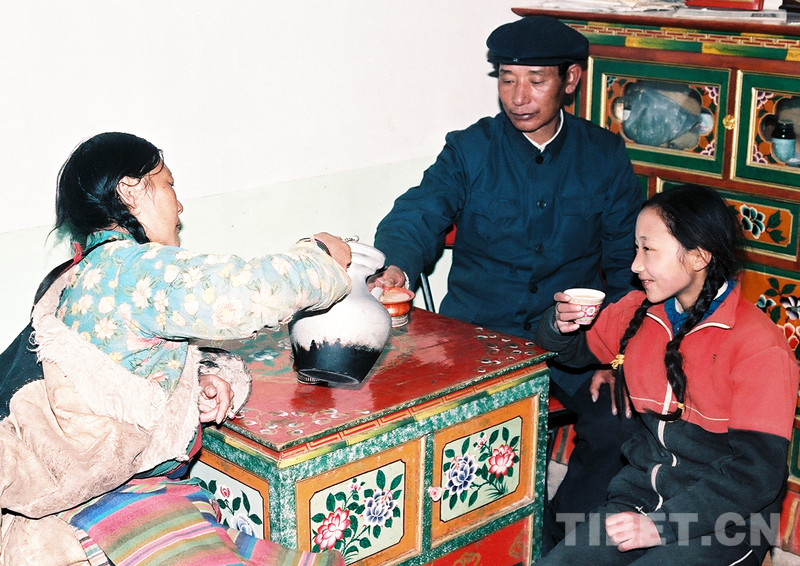 公覺紮朗的家在小鎮南邊的一排平房裏,屋裏擺設很簡單,隻有幾件普通的藏式家具。他的夫人央金和上小學的女兒(er) 玉珍見有客人來訪,將手抓肉、酸奶、奶片、酥油茶等食物統統擺在小藏桌上,不停地勸我吃,勸我喝……最後,我還給他們(men) 一家三口人拍了張喝酥油茶的照片。