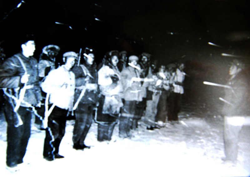 1974年,公覺紮朗(左二)等18勇士既是幹部,又是民兵。這是他們(men) 清晨在冒雪訓練(唐召明翻拍資料圖片)