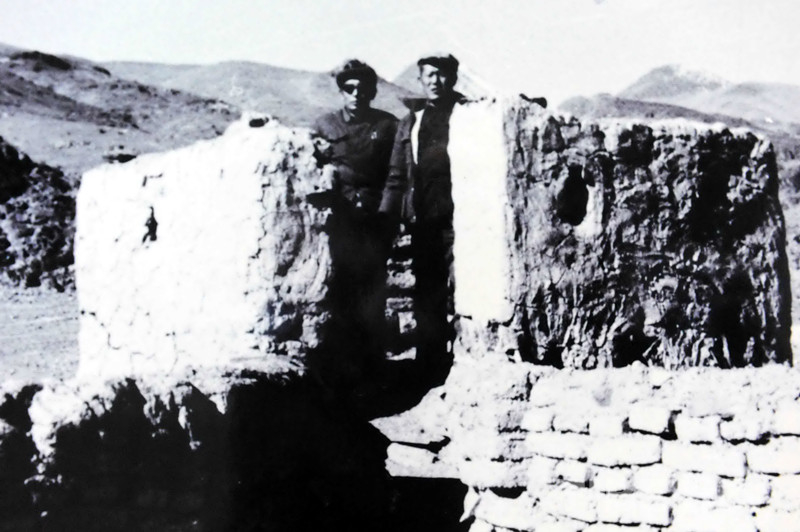 這是加林工作組公覺紮朗(左)和洛桑丹珍(右)在他們(men) 親(qin) 手所建的碉堡上合影留念(唐召明翻拍資料圖片,1974年攝)