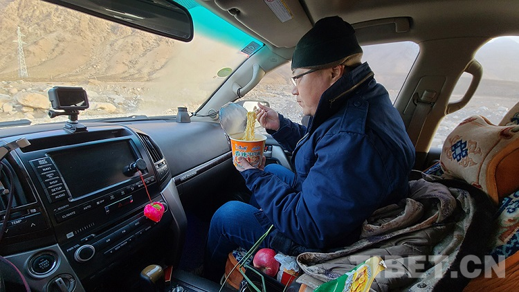 圖為(wei) 呂智勇自駕向阿裏普蘭(lan) 運送防疫物資期間,在車裏吃方便麵