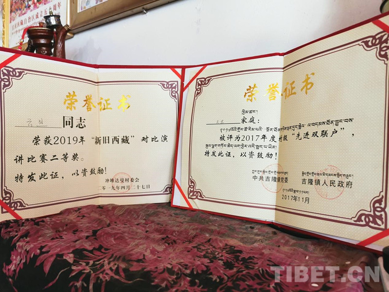 圖為(wei) 雲(yun) 丹獲得的榮譽證書(shu) 攝影:德吉卓瑪