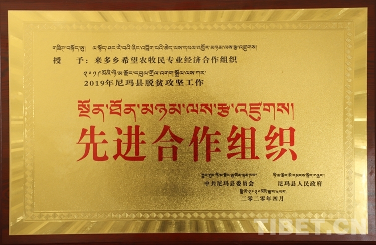 圖為(wei) 尼瑪縣委、政府頒發的先進合作組織獎牌