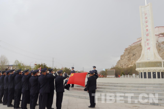 圖為(wei) 康馬邊境管理大隊民警在江孜宗山英雄紀念碑前重溫入黨(dang) 誓詞 楊朝祥 攝