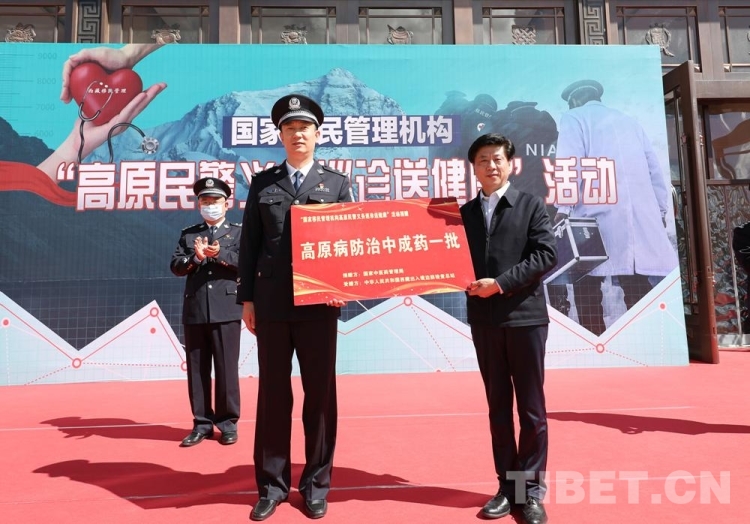圖為(wei) “高原民警義(yi) 務巡診送健康”活動啟動儀(yi) 式上,國家中醫藥管理局為(wei) 西藏出入境邊防檢查總站贈送一批高原病防治中成藥。 攝影:何宇恒