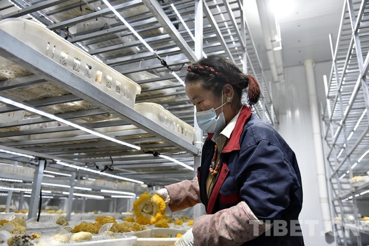 圖為(wei) 2020年8月拍攝的日喀則市珠峰一見則喜生物科技示範園區出菇棚裏工人正在采摘金耳 攝影:王媛媛