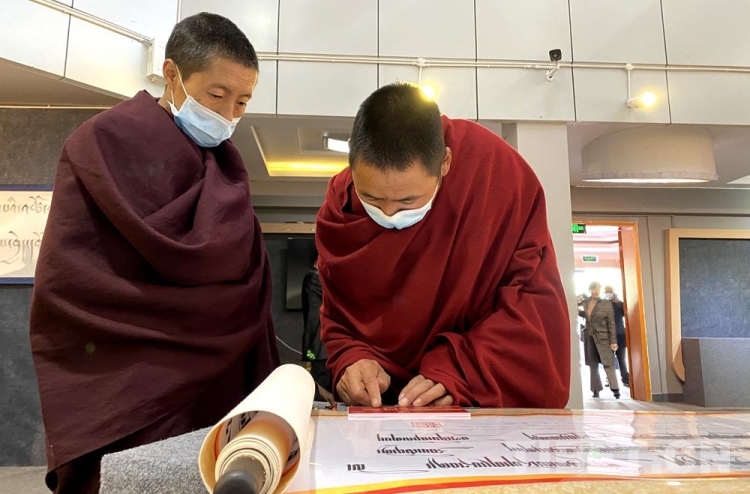 圖為(wei) 2021年5月,“同心共築中國夢”——西藏僧尼群眾(zhong) 書(shu) 法精品展現場,僧尼正在觀看展現了烏(wu) 金體(ti) 、朱匝體(ti) 等20餘(yu) 種風格迥異的藏文書(shu) 法體(ti) 係的書(shu) 法作品《藏文字體(ti) 大全》 攝影:王媛媛