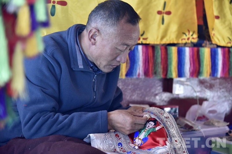 圖為(wei) 2021年4月拍攝的西藏自治區非物質文化遺產(chan) 項目拉薩堆繡唐卡代表性傳(chuan) 承人羅布正在製作堆繡唐卡 攝影:王媛媛