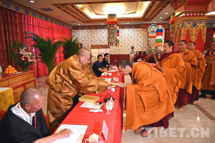 圖為(wei) 中國佛教協會(hui) 副會(hui) 長、藏傳(chuan) 佛教學銜工作指導委員會(hui) 主任、中國藏語係高級佛學院院長嘉木樣活佛向學員頒發學銜證書(shu)