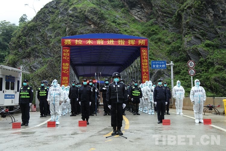 圖為(wei) 聶拉木出入境邊防檢查站移民警察聯合地方單位在友誼橋頭表決(jue) 心 西藏出入境邊防檢查總站供圖