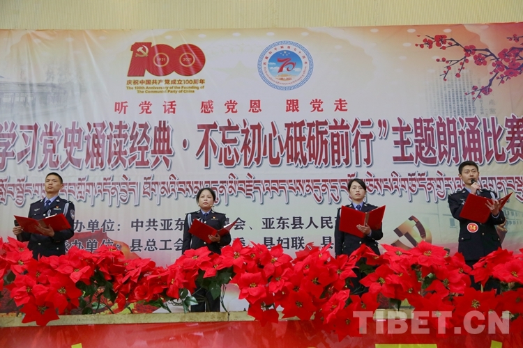 圖為(wei) 西藏亞(ya) 東(dong) 出入境邊防檢查站參加亞(ya) 東(dong) 縣“學習(xi) 黨(dang) 史誦讀經典、不忘初心砥礪前行”主題朗誦比賽
