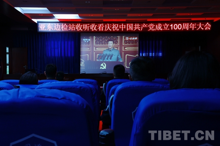 圖為(wei) 西藏亞(ya) 東(dong) 出入境邊防檢查站組織民警觀看慶祝中國共產(chan) 黨(dang) 成立100周年大會(hui)