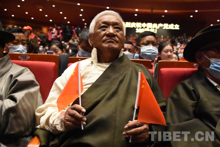 圖為(wei) 來自日喀則市嘎玉林老黨(dang) 員丹增在看演出 攝影:次旦拉姆