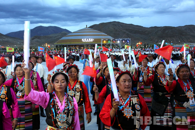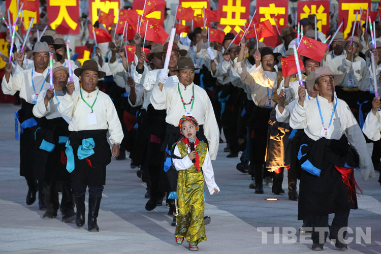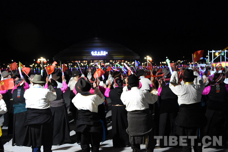 珠峰文創園區的聯歡活動分為(wei) 三個(ge) 章節,以《在燦爛的陽光下》《各族人民感恩黨(dang) 》《西藏人民齊歡唱》三首歌曲作為(wei) 開篇樂(le) ,來自日喀則各族各界的演員們(men) ,身著日喀則特色節日盛裝,在廣場中央,擺出數字“100”的造型,跳起歡快的鍋莊舞,在燈光的輝映下,造型美輪美奐。