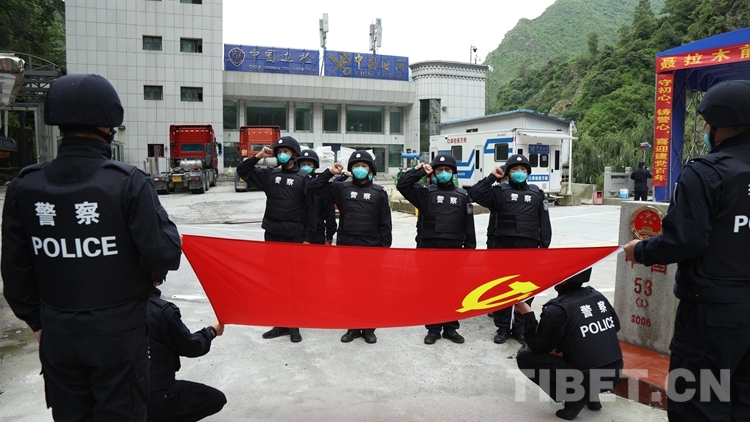 圖為(wei) 友誼橋執勤點民警在53號界碑旁對黨(dang) 旗宣誓 攝影:鄒興(xing) 國
